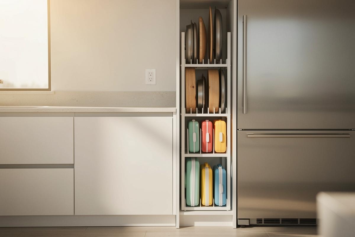 | Arbeitsbereich | Schneidebretter, Backbleche, Tabletts | Griffbereit, platzsparend, aufrecht |
